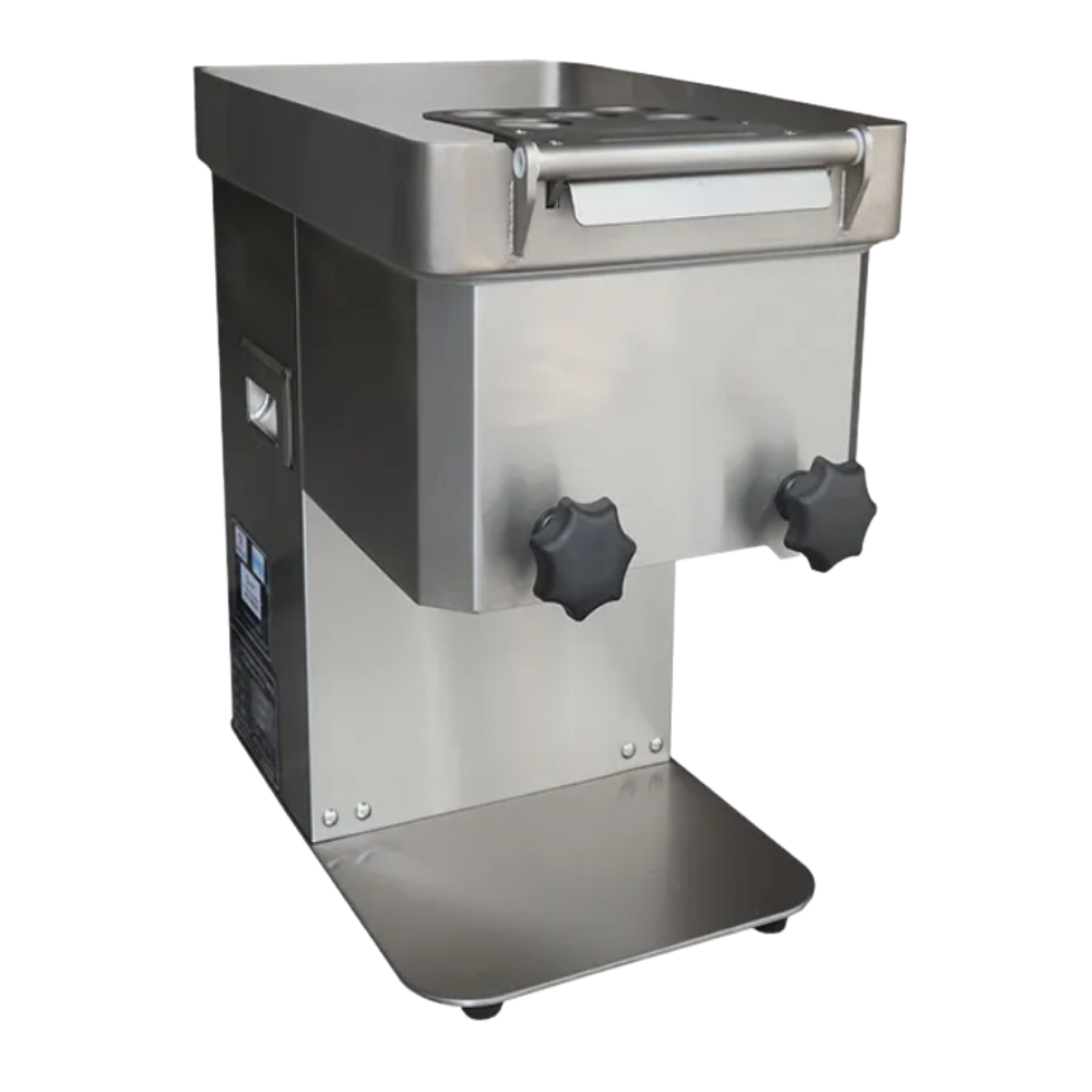 Use chilled meat (below 4 °C/40 °F), secure it firmly, and feed it steadily. Keep the slicing plate sharp and the feed tray clear of build-up for uniform slices every time.