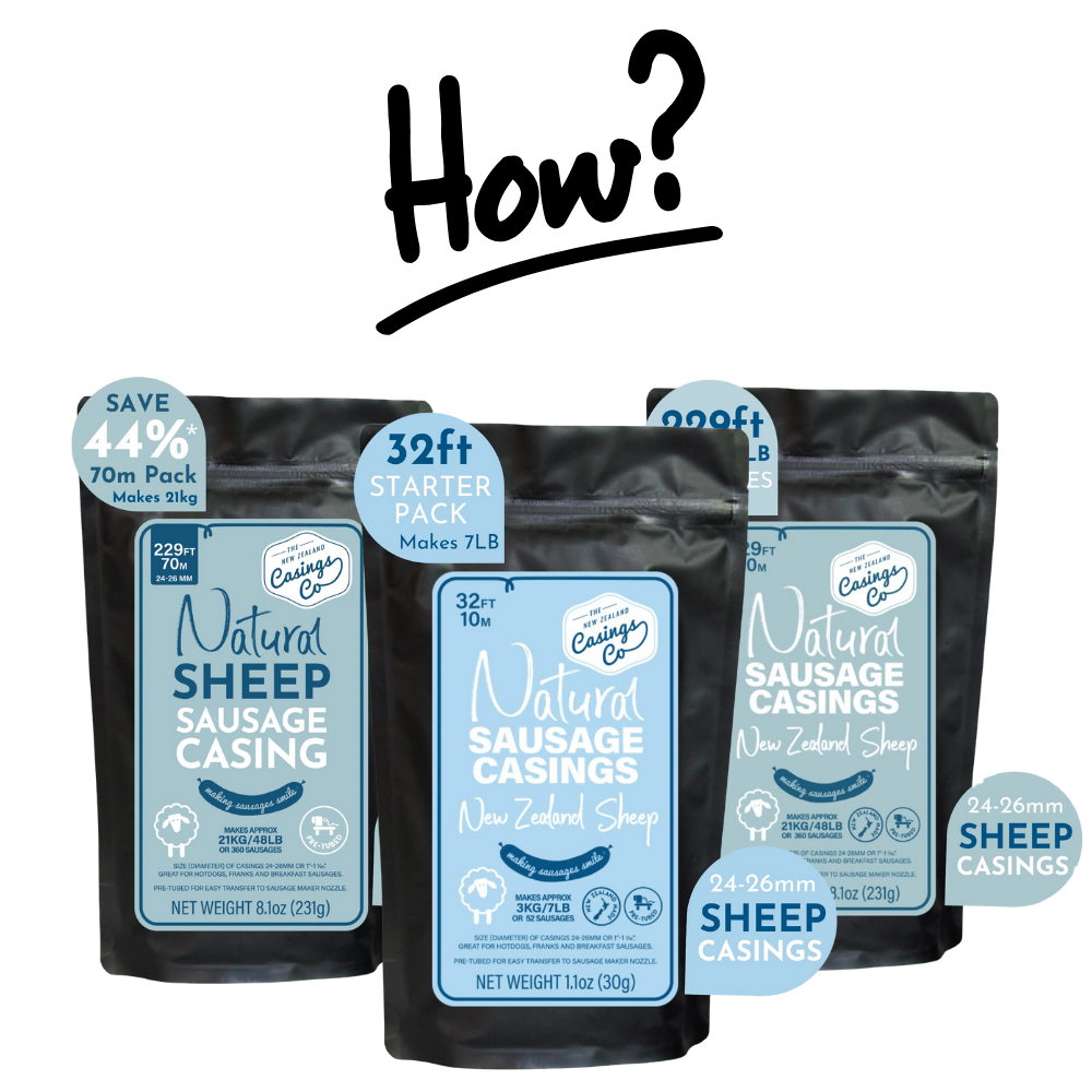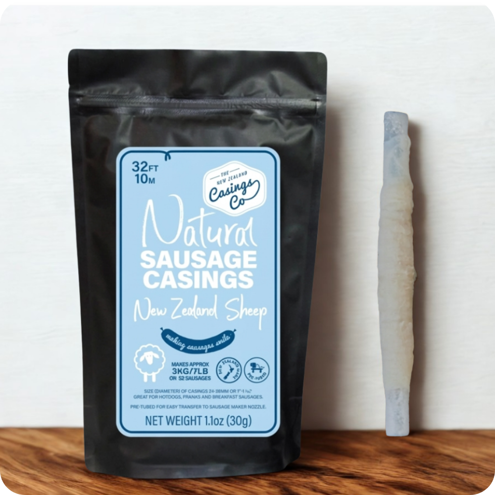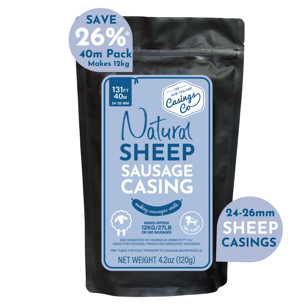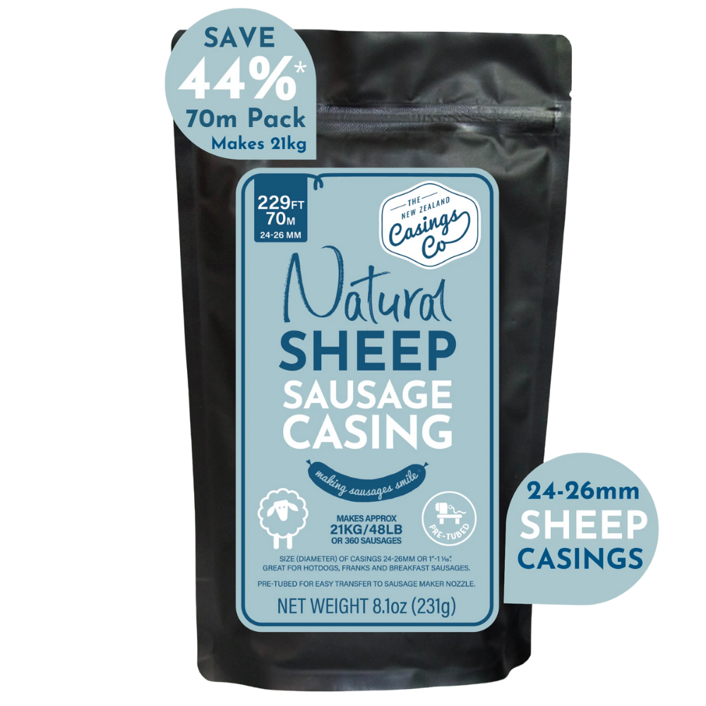 These 24-26mm natural sheep casings are carefully graded for uniform diameter, giving you sausages that cook evenly and hold their structure without feeling tough or chewy. Sheep casings are naturally thinner than hog casings, which makes them ideal for sausages where tenderness and snap matter most.